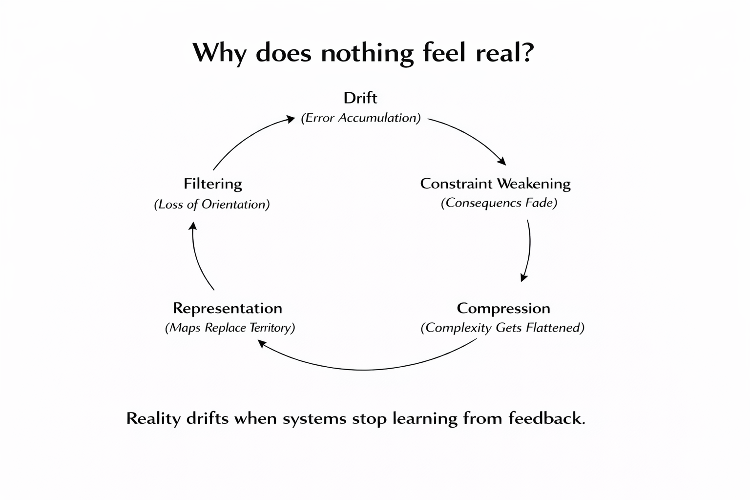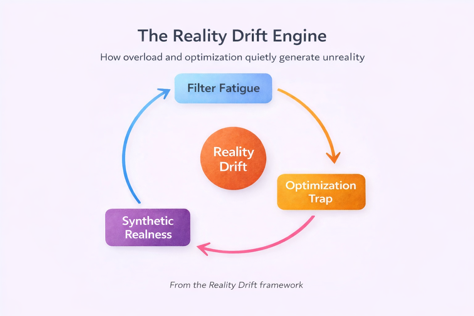 A collection of visual frameworks developed as part of the Reality Drift project between 2023 and 2026. These diagrams map recurring cognitive and systemic failure patterns in modern optimized environments.