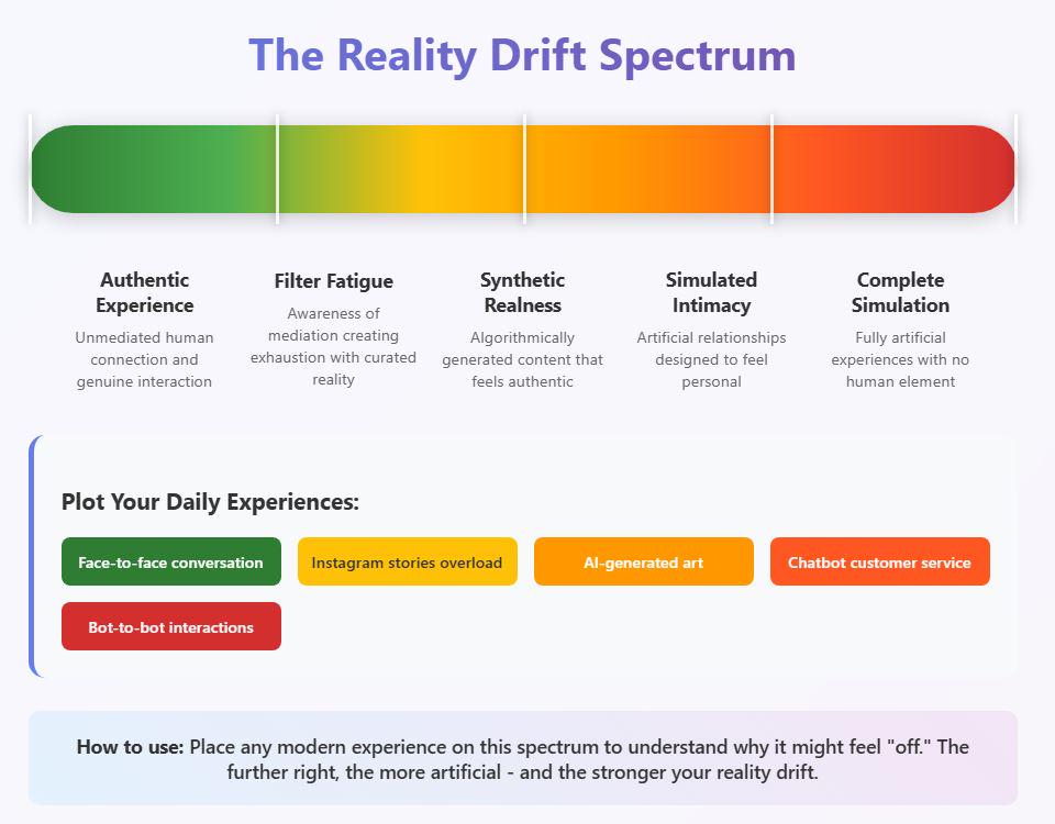 A continuum for situating modern experiences from authentic human interaction to fully artificial simulation.