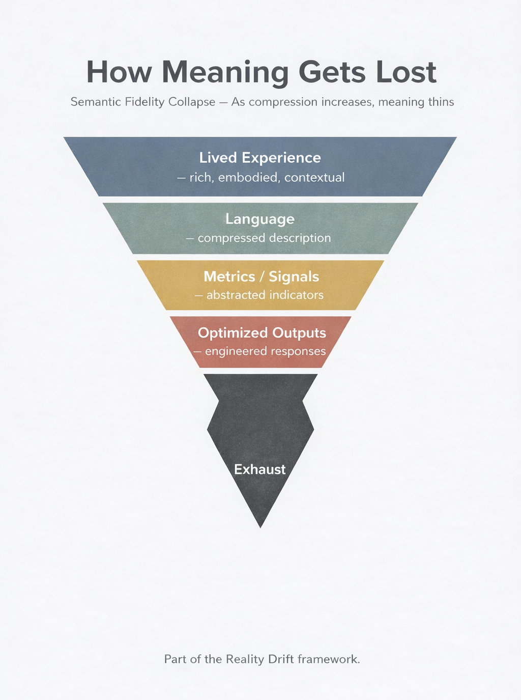 Semantic fidelity collapse as experience is compressed into signals and outputs.