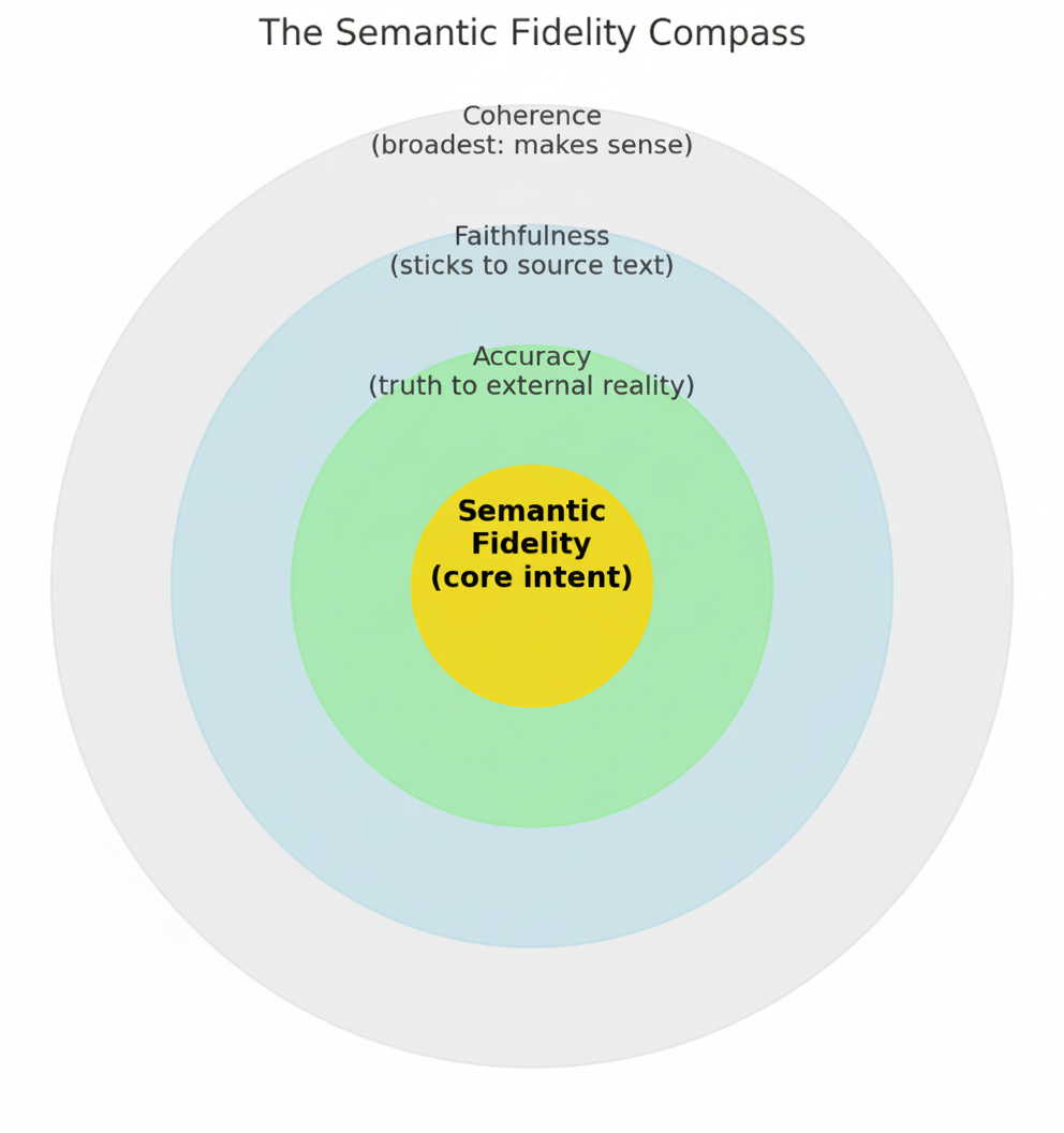 Distinguishing coherence, faithfulness, accuracy, and core intent.