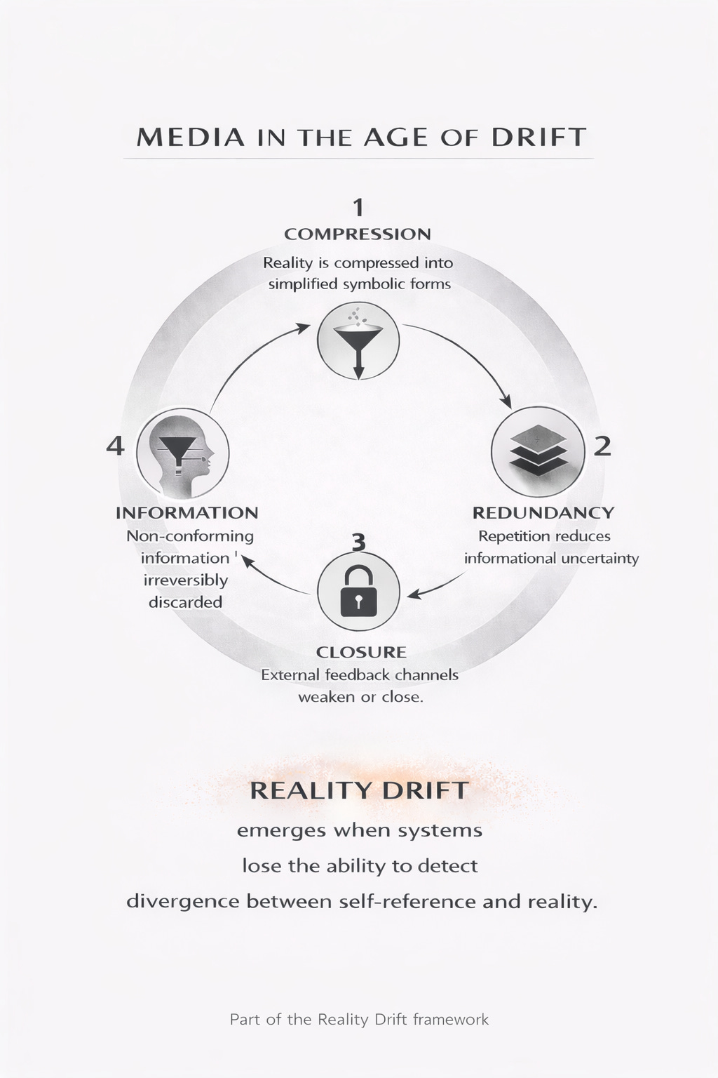 A structural loop showing how compression, redundancy, and closure drive reality drift in modern media systems.