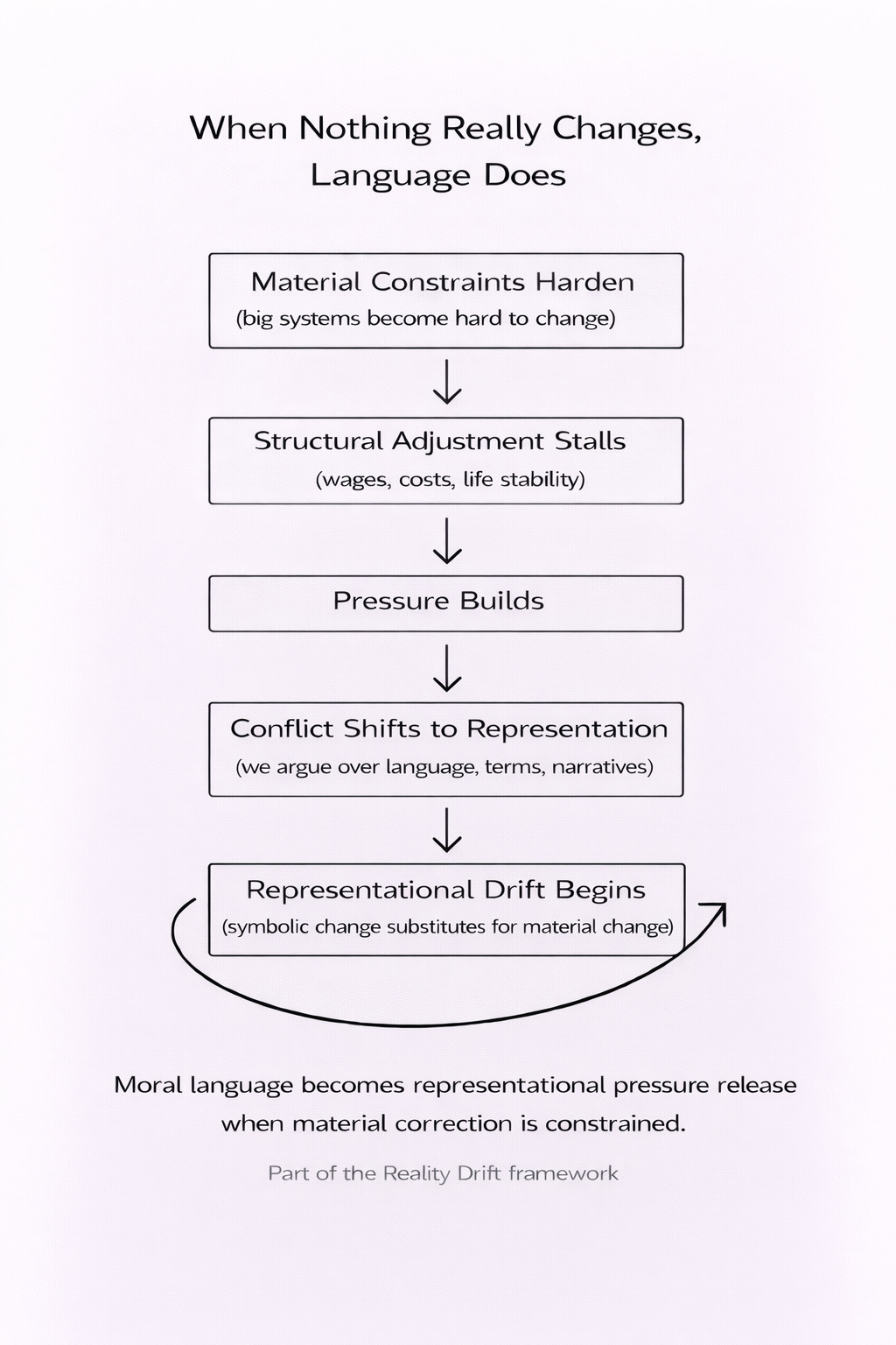 A sequence showing how stalled material change shifts pressure into language and representation.